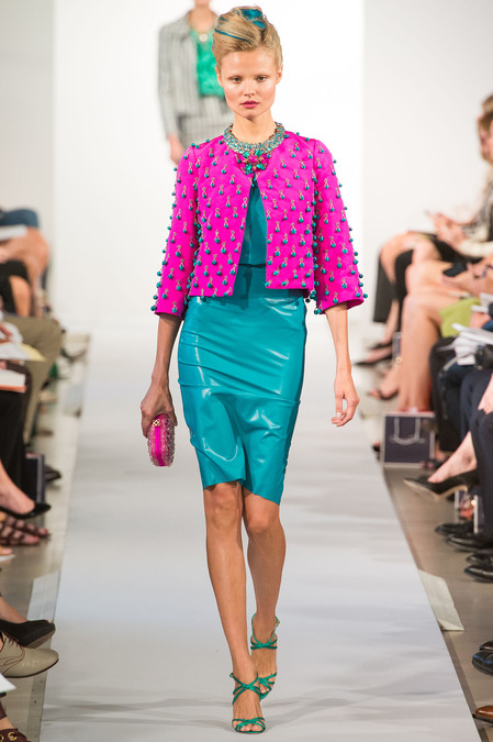 El más estricto American Style con un toque Cruella de Vil en los mechones de pelo de las modelos, un toque "moderno" para lo que solemos ver en Oscar de la Renta. Sus tejidos habituales, como el chanel o brocados se tiñen de colores vivos desde el chillón rosa neón hasta el verde más candy.